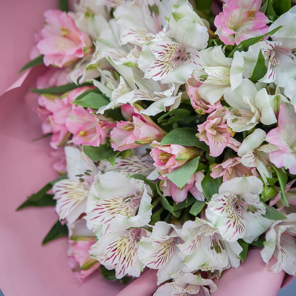 альстромерия белые – 8 шт.альстромерия розовые – 7 шт.Атласная лента – 1 шт.