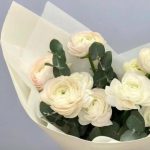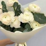 Эвкалипт – 4 шт.Лента атласная – 1 шт.Ранункулюс – 9 шт.Упаковка дизайнерская – 1 шт.