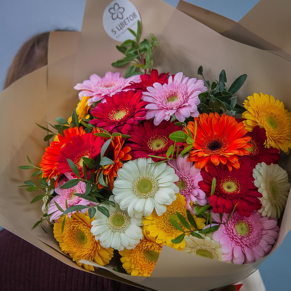 Гербера желтая – 5 шт.Гербера красная – 5 шт.Гербера розовая – 5 шт.Гербера белая – 5 шт.Гербера кремовая – 3 шт.фиолетовая – 2 шт.