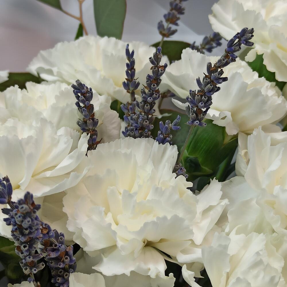 Белые гвоздики с лавандой и зеленью