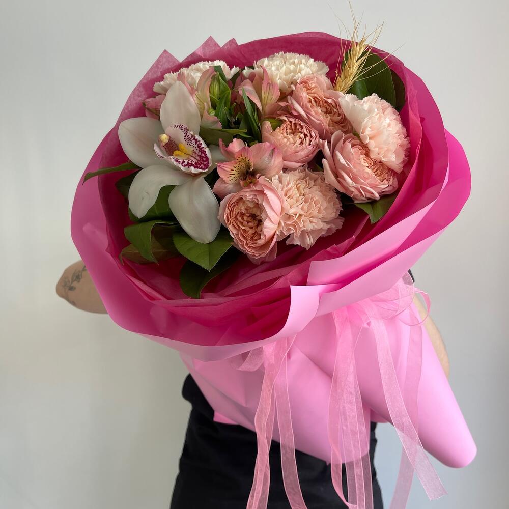 Альстромерия – 1 шт.Орхидея Цимбидиум – 1 шт.Лента атласная – 2 шт.Диантус – 4 шт.Пленка матовая – 6 шт.джульетта – 1 шт.Салал пучок – 1 шт.Пшеница (сухоцвет) – 1 шт.
