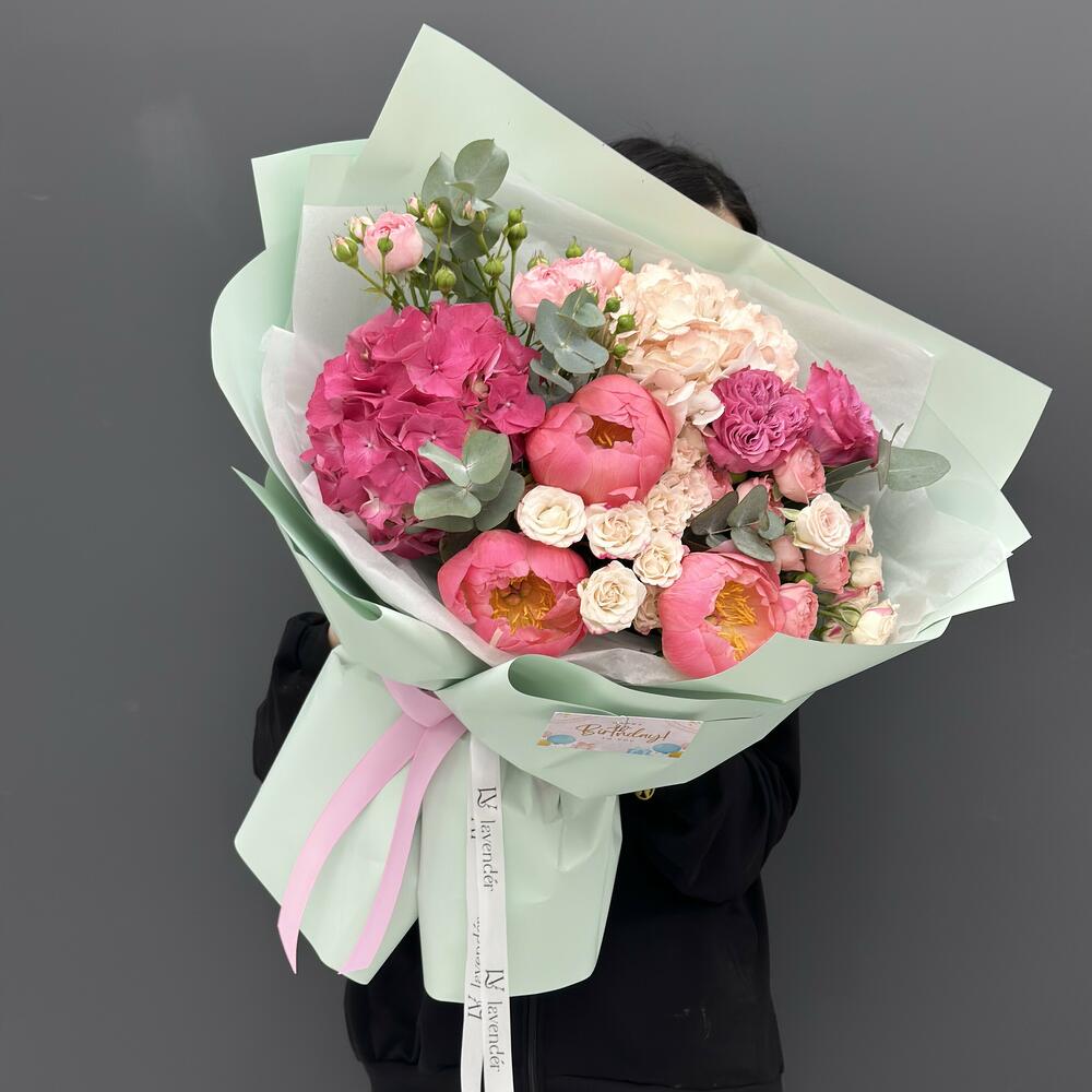 Гвоздики, Кустовые розы, Лизиантусы, Пионовидные розы, Розы