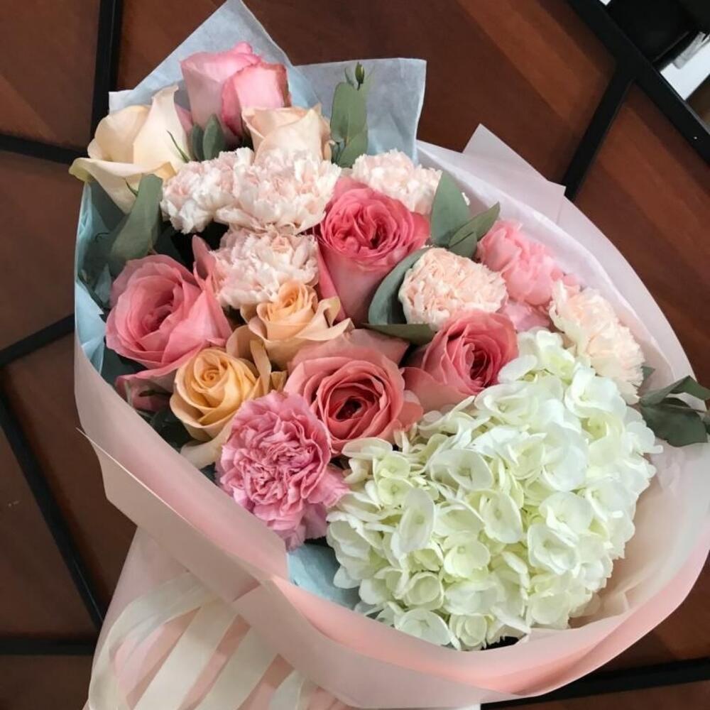Гвоздики, Кустовые розы, Пионовидные розы, Розы