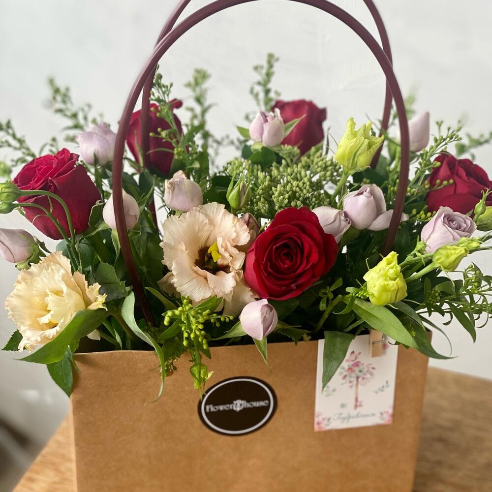 Цветочная композиция в губке. Удобная упаковка в виде сумочки с ручками идеальна для транспортировки и последующего хранения. Не требует никакого специального хранения