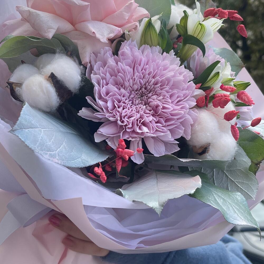 Альстромерия – 1 шт.Папоротник – 1 шт.Хлопок – 3 шт.Хризантема – 2 шт.Лента атласная – 2 шт.Пленка – 2 шт.Сухоцветы – 3 шт.Салал пучок – 1 шт.Охара – 1 шт.тишь – 2 шт.