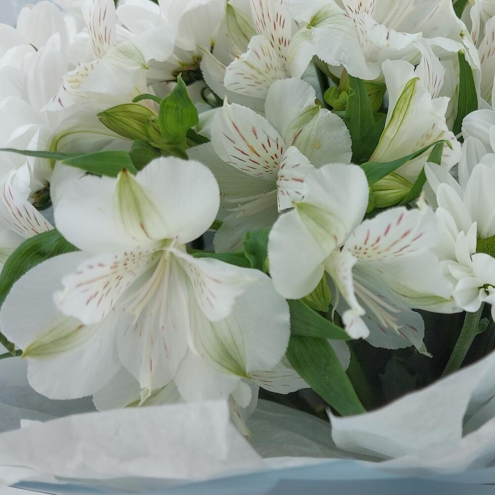 Хризантема Кустовая Бакарди белая – 3 шт. Альстромерия – 4 шт. Упаковка дизайнерская – 1 шт.