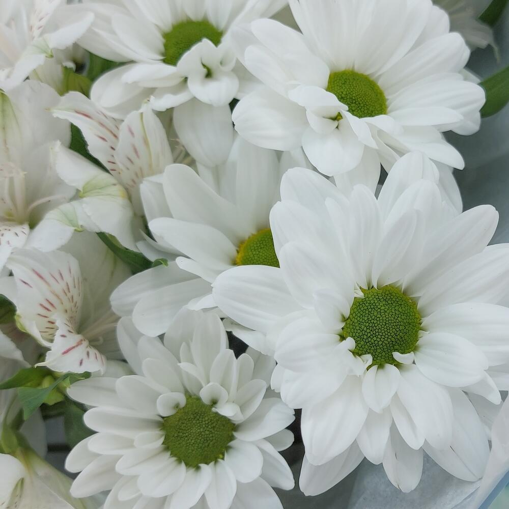 Стойкий букет из ромашковых хризантем и альстромерий. Такой букет всегда уместен и подойдёт для любого повода: День Рождения, именины, годовщина свадьбы, рождение ребенка, 8 марта, День Святого Валентина, выпускной и т.д. Можно вручить маме, сестре, подруге, коллеге, учителю, любимой.