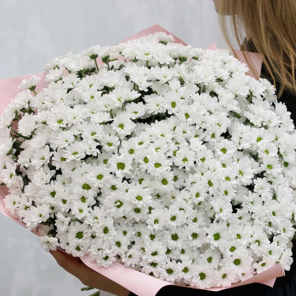 Букет из 75 белых кустовых хризантем Сантини в стильной упаковке