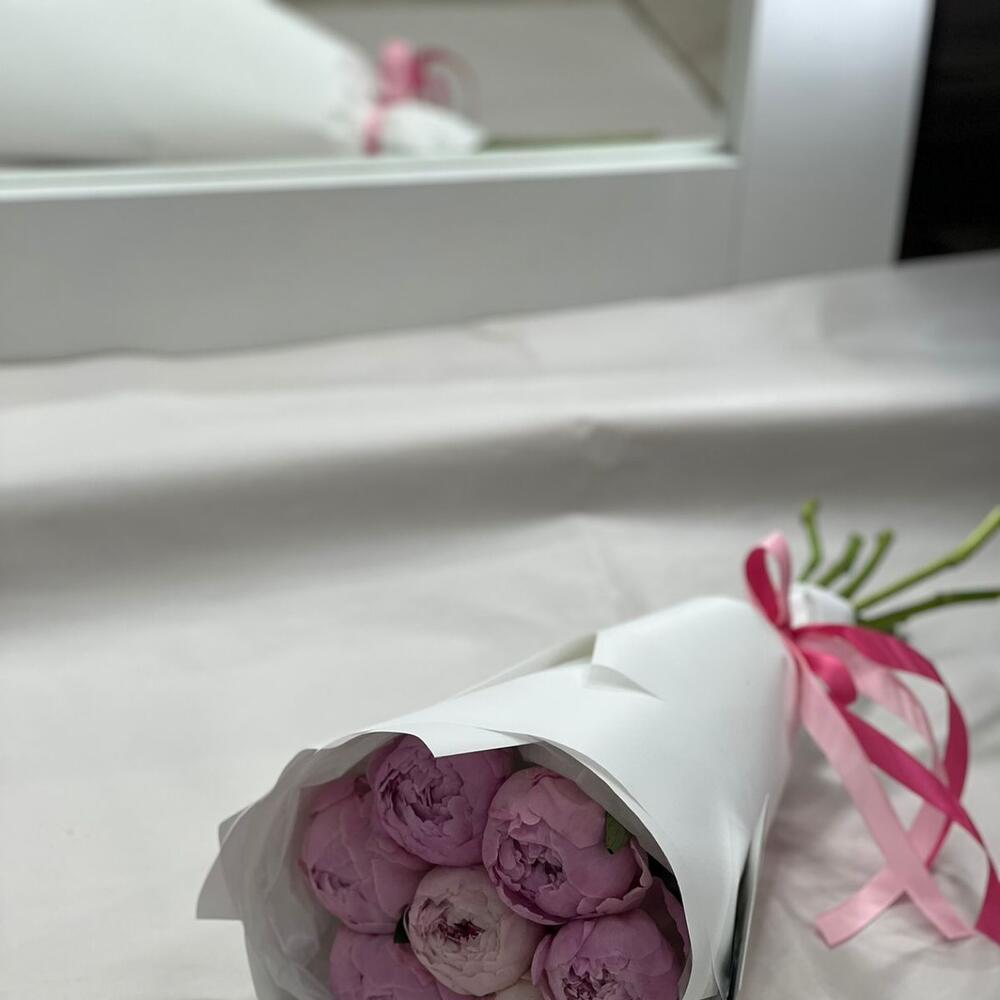 пион премиум розовый – 7 шт.Упаковка – 2 шт.Лента атласная – 1 шт.