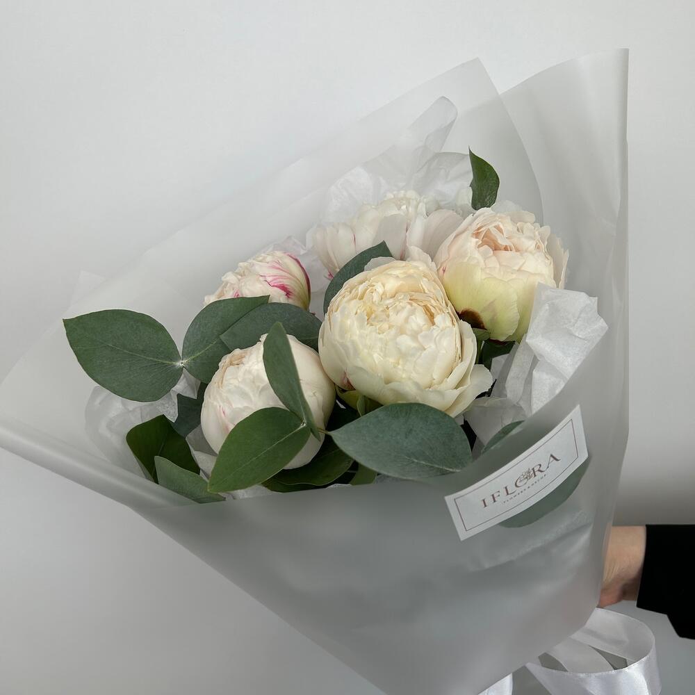 Эвкалипт – 3 шт.Дизайнерская упаковка – 1 шт.белые пионы – 5 шт.