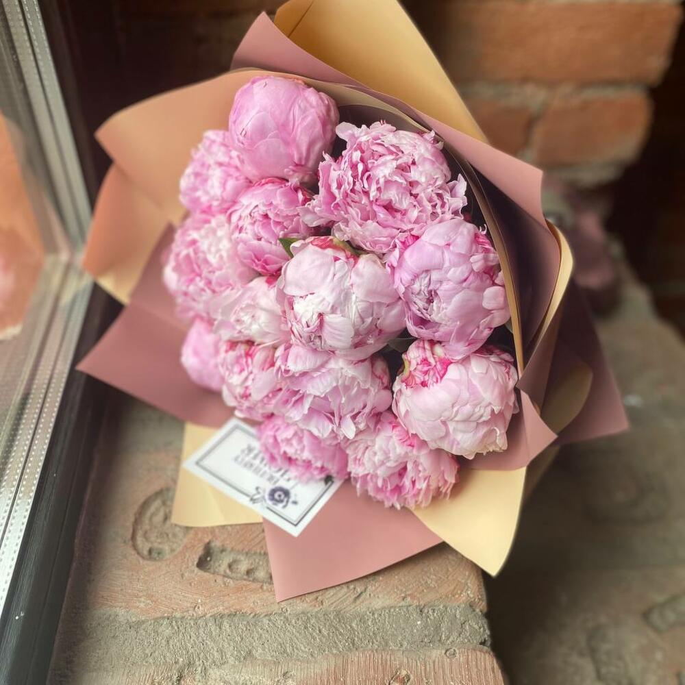 Букет из 15 розовых пионов в дизайнерской упаковке “Принцесса Маргарита”