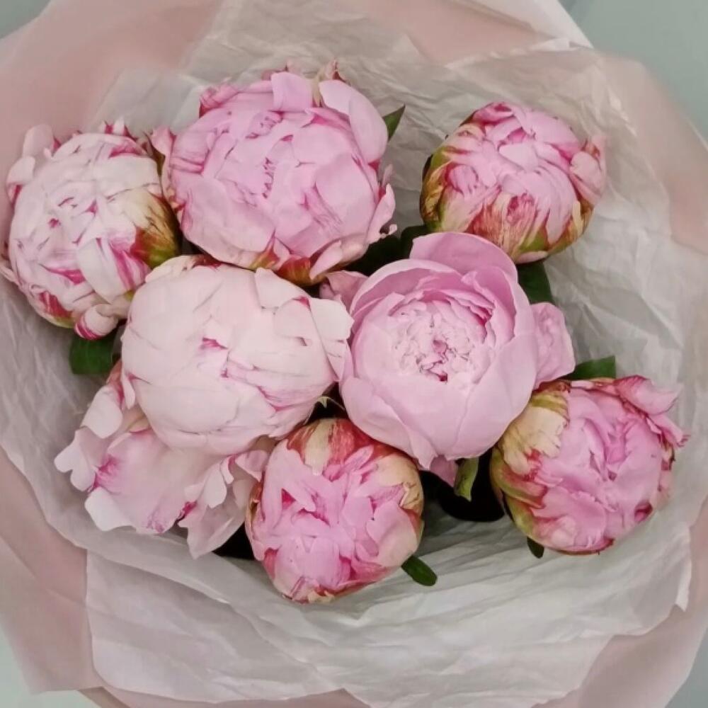 Лента атласная – 1 шт.Упаковка дизайнерская – 4 шт.пионы сара бернар – 7 шт.