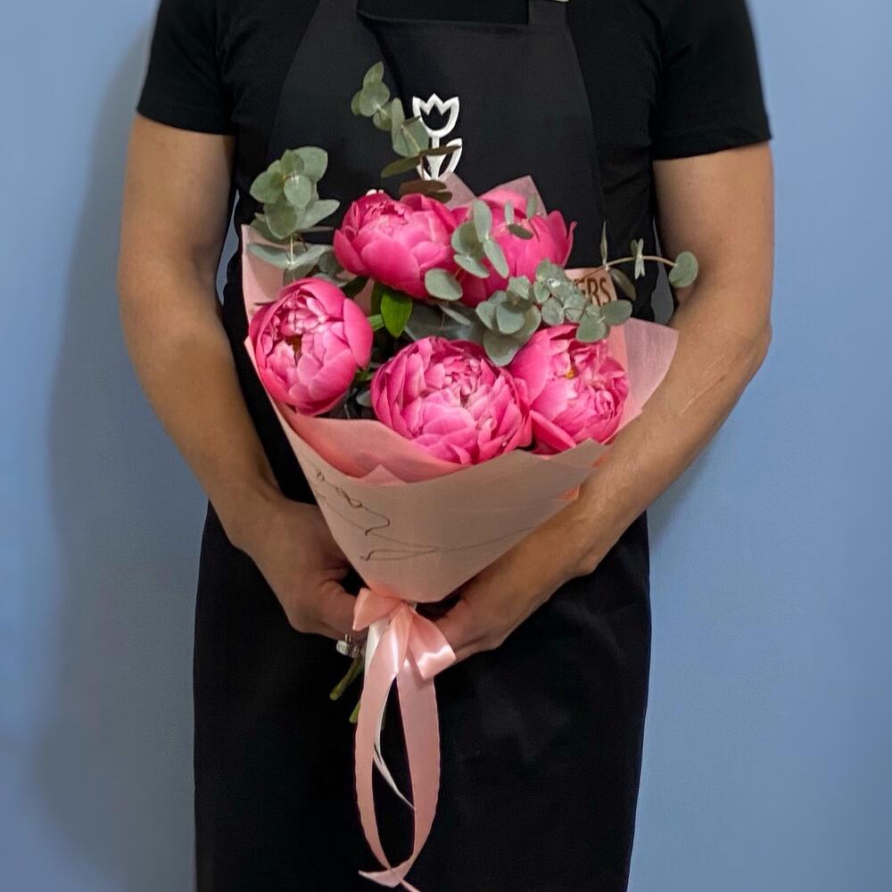 Пион – 5 шт.Эвкалипт – 3 шт.Упаковка – 1 шт.Лента атласная – 1 шт.