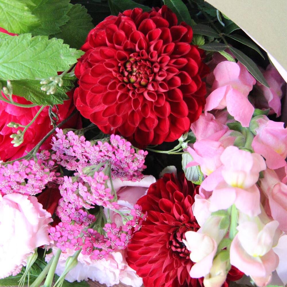 Георгина – 2 шт.Пион – 2 шт.даукус – 1 шт.Альстромерия – 1 шт.лизтантус – 1 шт.Львиный зев – 1 шт.Ахиллея – 1 шт.Ветки малины – 2 шт.Фисташка – 1 шт.Упаковка – 1 шт.Лента – 1 шт.