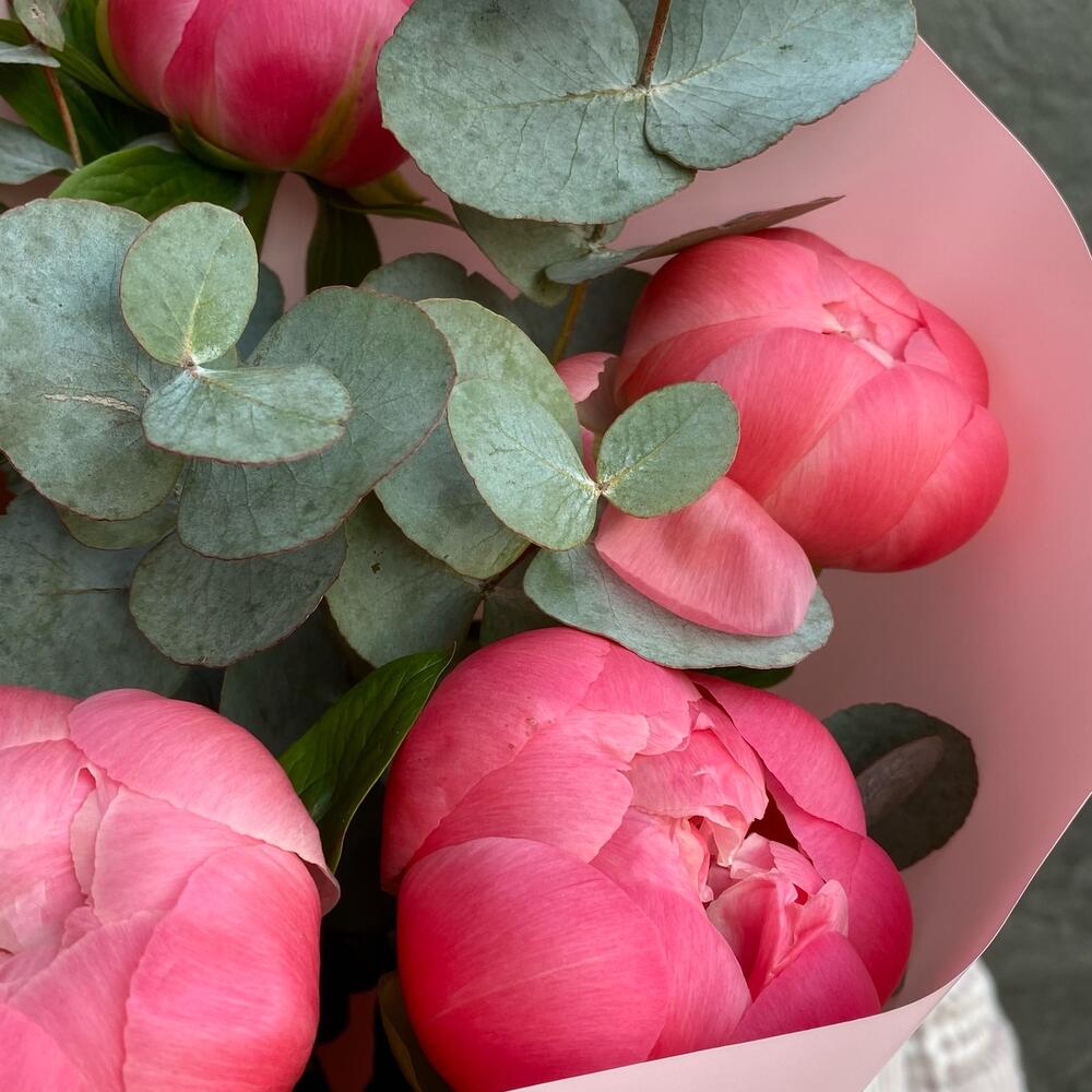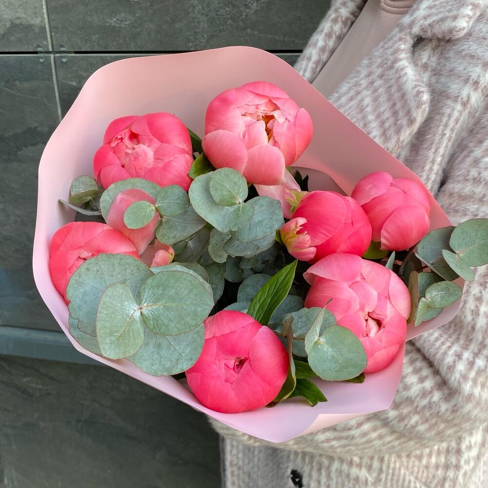 Пион Коралл Шарм (Coral Charm) – 7 шт.Лента атласная – 1 шт.Эвкалипт Синерия – 1 шт.Дизайнерская упаковка – 1 шт.
