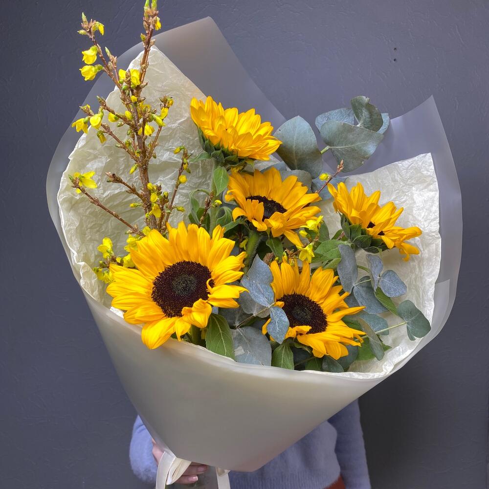 Лента атласная – 1 шт.Тишью – 2 шт.Подсолнух – 5 шт.Упаковка дизайнерская – 2 шт.Эвкалипт пучок – 1 шт.форзиция ветки – 2 шт.