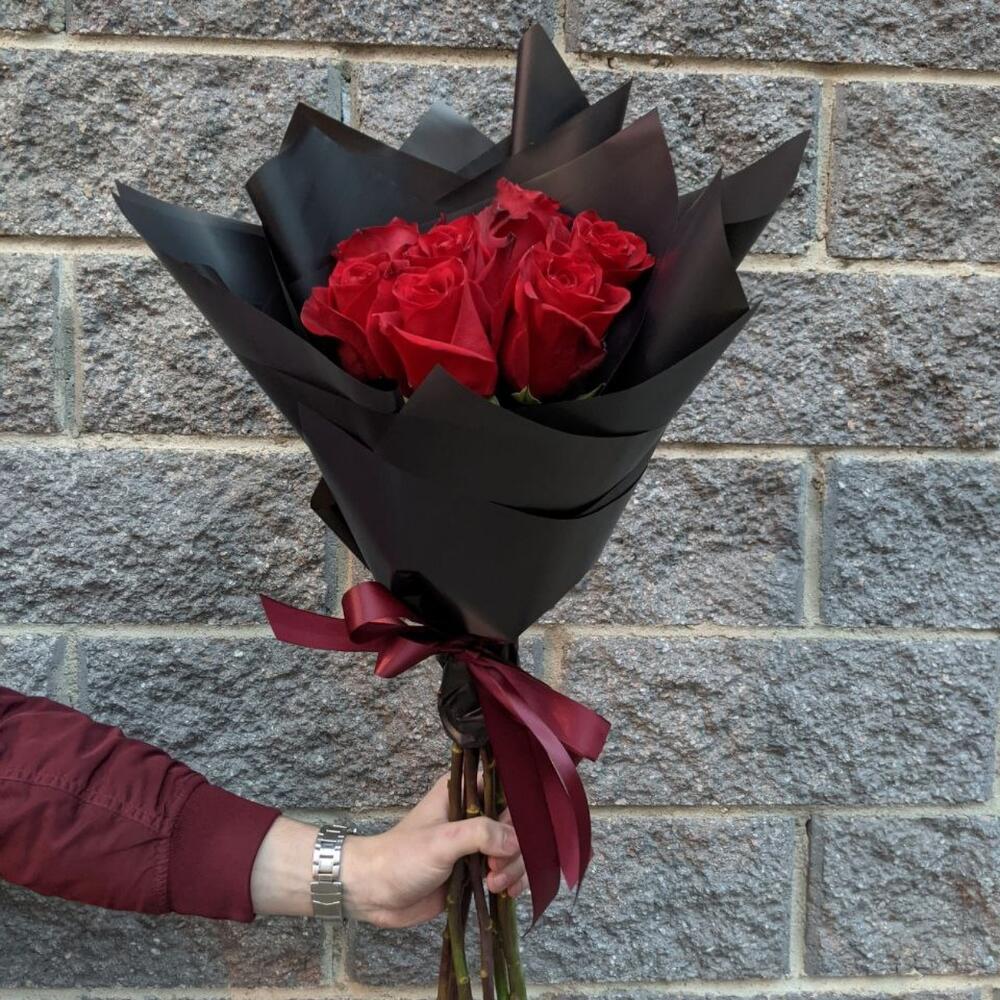 роза эквадор красная 70 см – 7 шт.черная корейская пленка – 2 шт.Атласная лента – 1 шт.