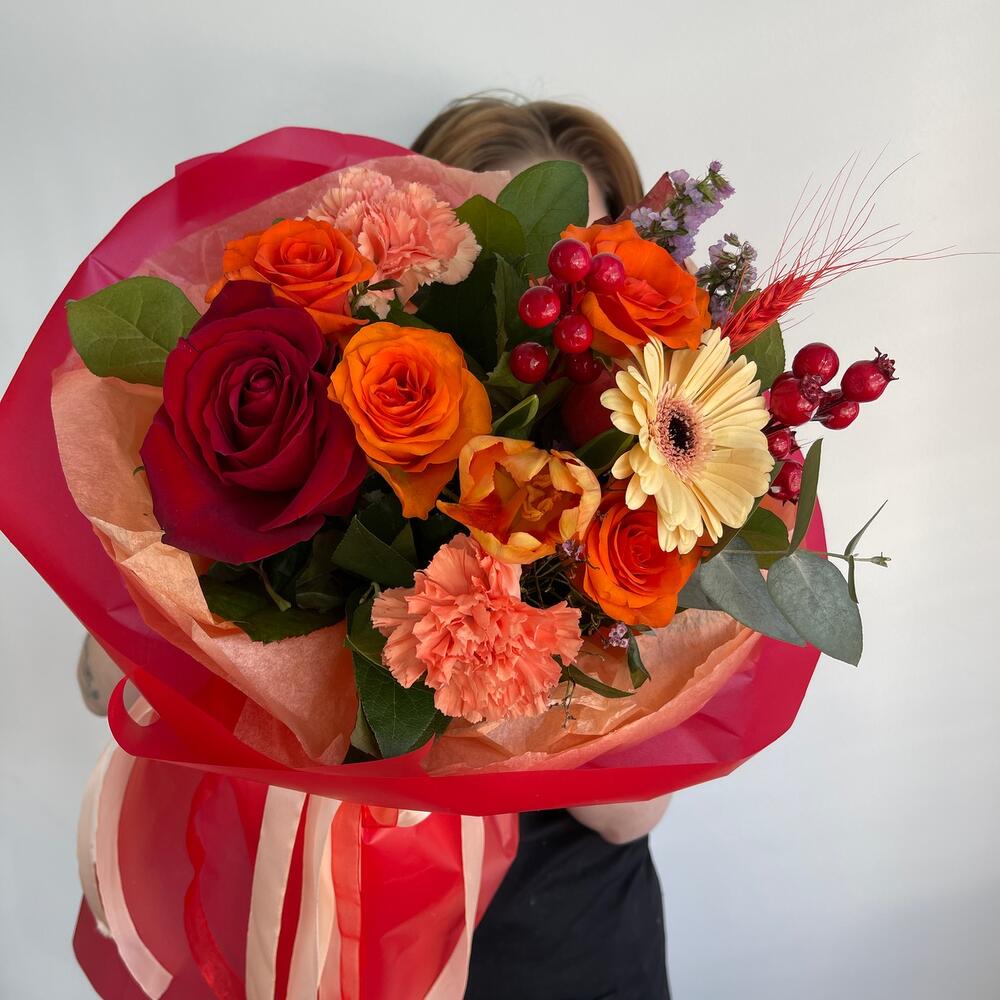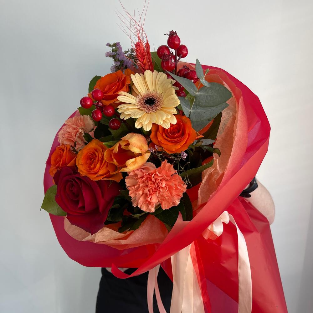 Роза – 5 шт.Гербера – 1 шт.Диантус – 2 шт.Тюльпан – 1 шт.Пшеница – 2 шт.Ягоды декоративные – 2 шт.Салал пучок – 1 шт.Упаковка дизайнерская – 2 шт.Лента атласная – 2 шт.