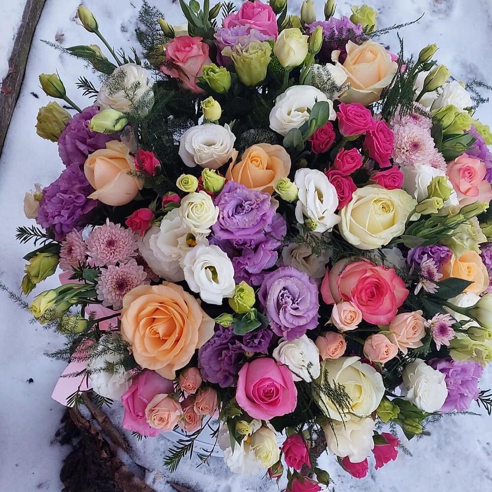 Роза кустовая – 5 шт. Хризантема кустовая – 5 шт. Эвкалипт – 5 шт. Эустома – 15 шт. розы разноцветные – 15 шт. коробка большая шляпная – 1 шт.