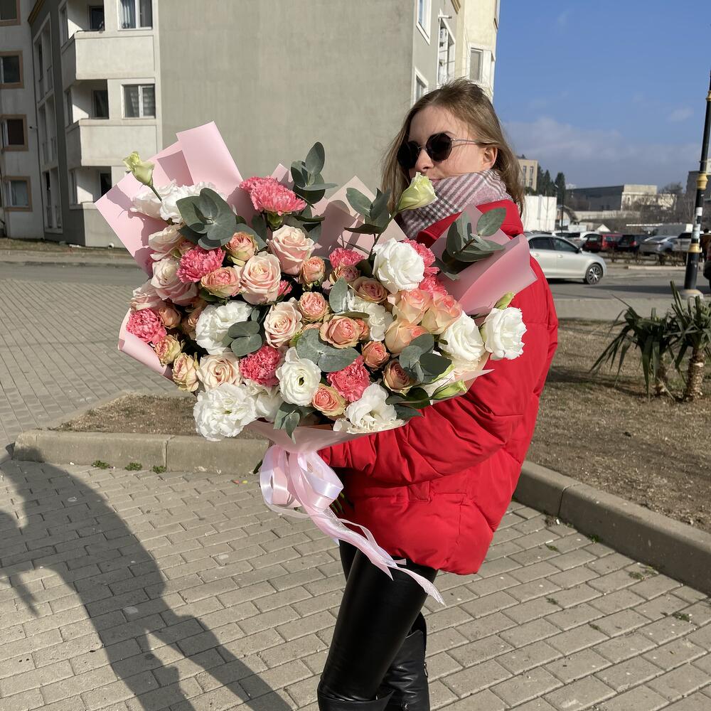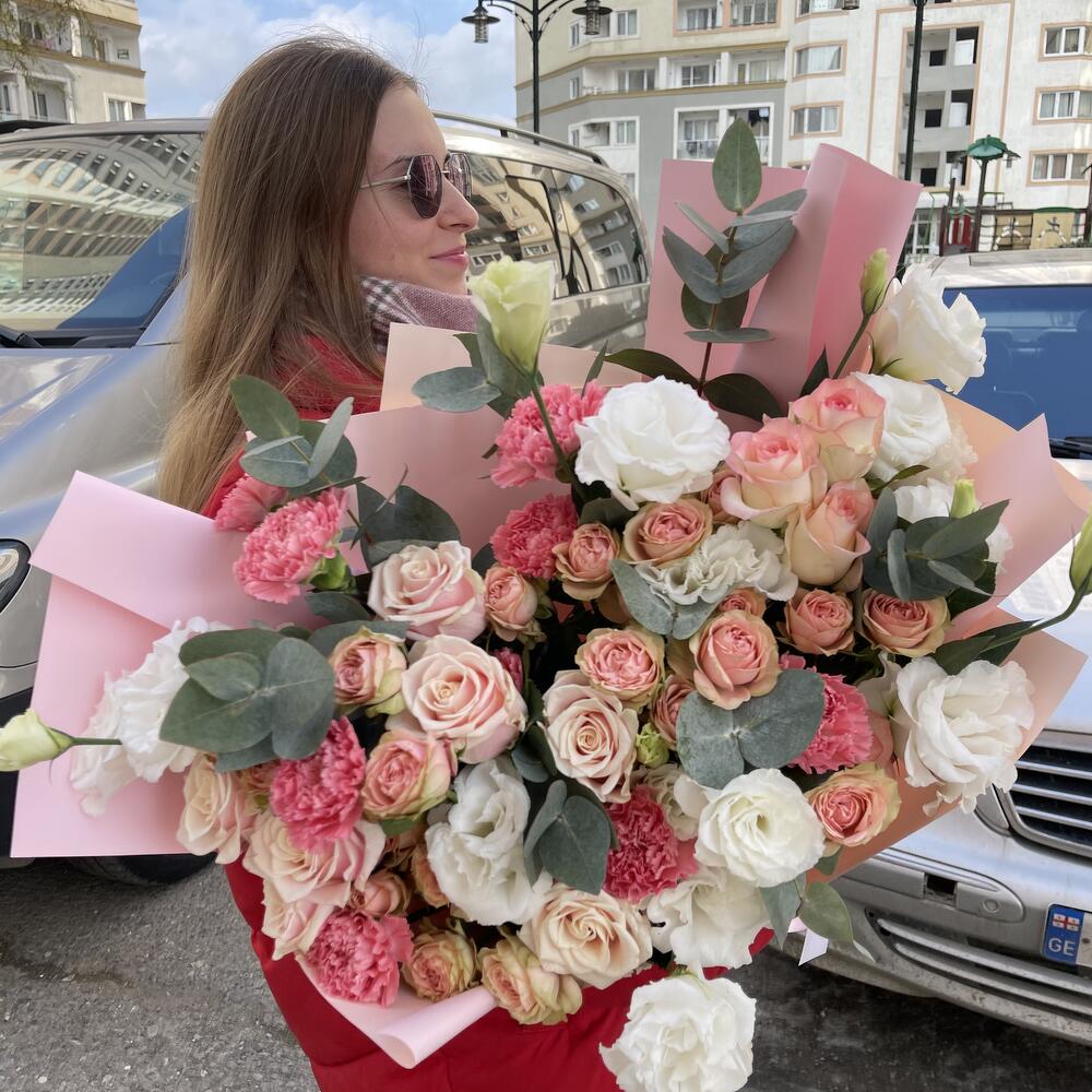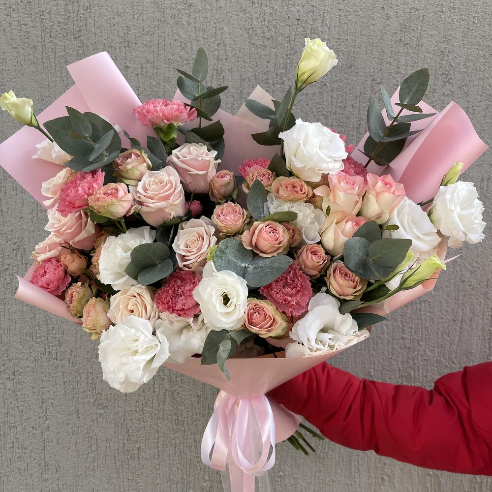 Гвоздики, Кустовые розы, Лизиантусы, Пионовидные розы, Розы