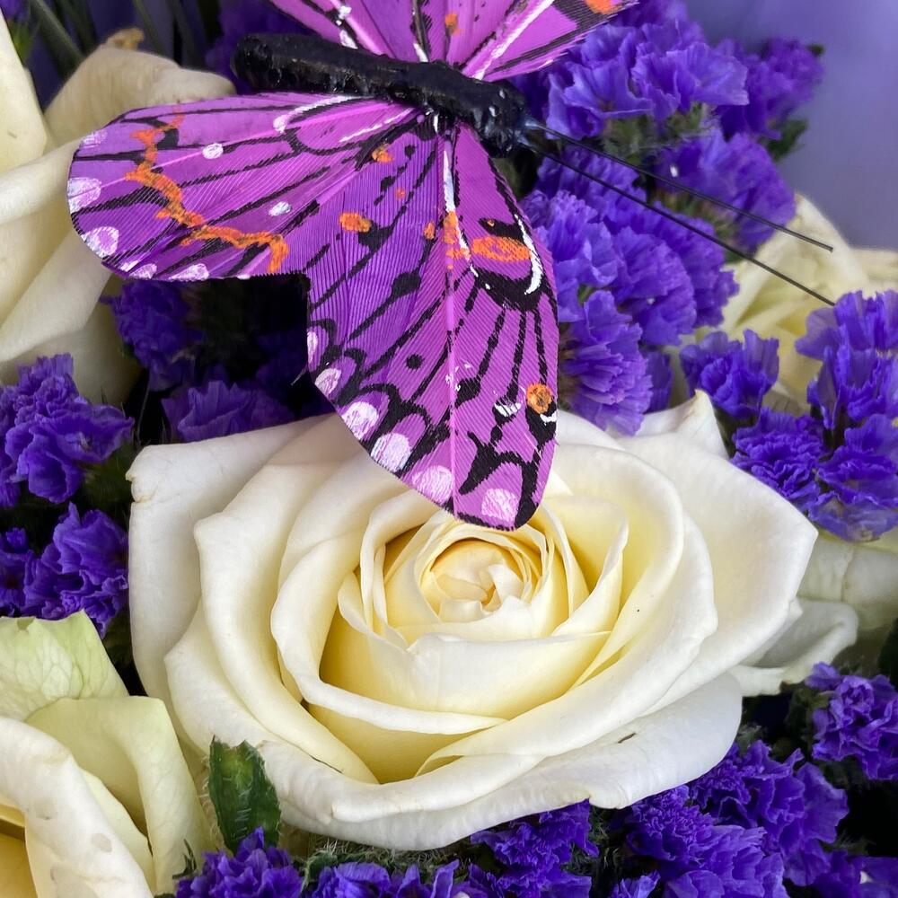 Роза одноголовая – 5 шт.Статица – 5 шт.зелень пучок – 1 шт.Декор бабочка – 1 шт.Упаковка дизайнерская – 1 шт.