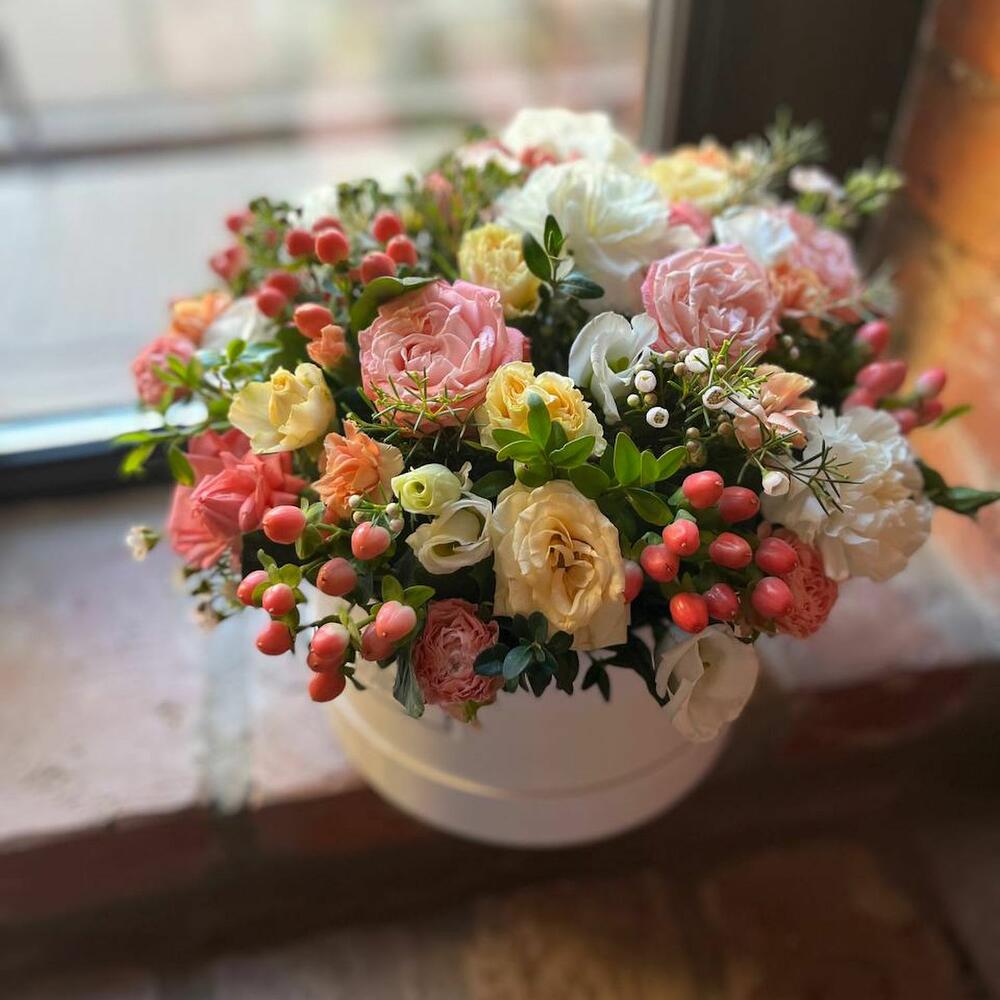 Роза кустовая – 15 шт.Гиперикум розовый – 7 шт.Гвоздика белая – 5 шт.Гвоздика кустовая желтая – 5 шт.Трахелиум – 5 шт.Хамелациум – 3 шт.Гвоздика розовая – 2 шт.Фисташка – 5 шт.Шляпная коробка – 1 шт.Оазис – 2 шт.