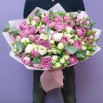 Роза пионовидная кустовая – 11 шт. Роза кустовая белая – 19 шт. Эвкалипт – 5 шт. Упаковка дизайнерская – 3 шт. Открыточка с вашими пожеланиями – 1 шт.
