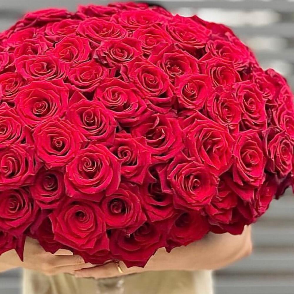 Роза красная – 101 шт.Лента атласная – 2 шт.Открытка – 1 шт.инструкция по уходу за цветами – 1 шт.хорошее настроение – 100 шт.коробка переноска – 1 шт.Кризал – 1 шт.