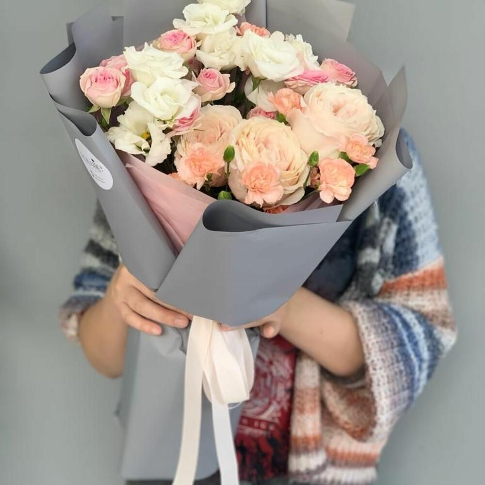 Альстромерии, Гвоздики, Кустовые розы, Лизиантусы, Розы, Хризантемы