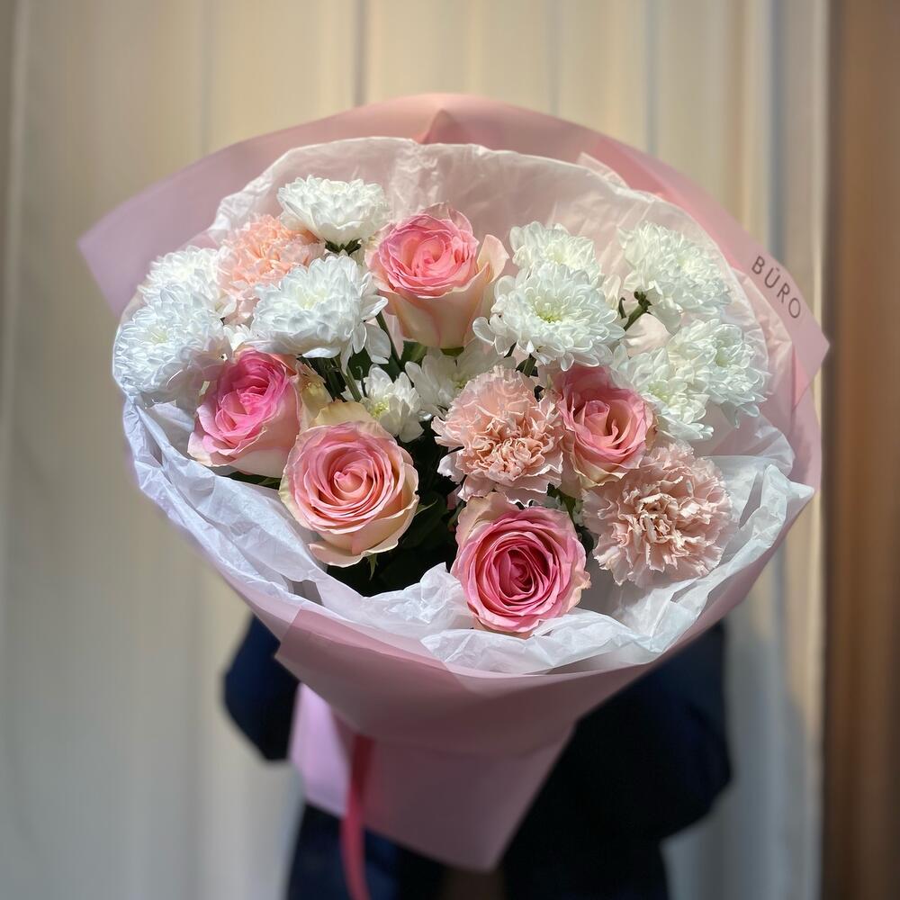 Альстромерии, Гвоздики, Кустовые розы, Лизиантусы, Розы, Хризантемы