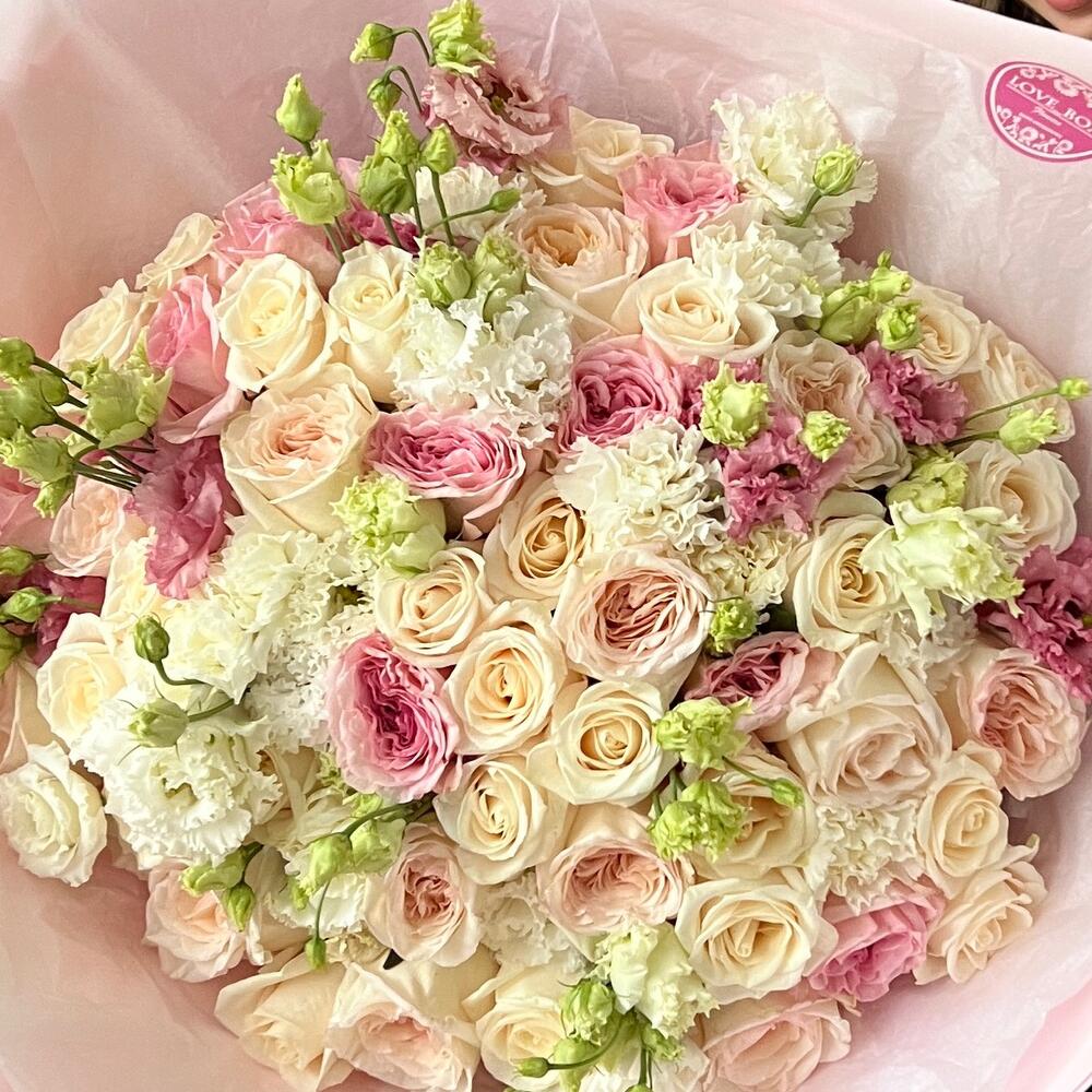 Роза – 65 шт.Лизиантус – 12 шт.Диантус – 8 шт.Дизайнерская упаковка – 5 шт.