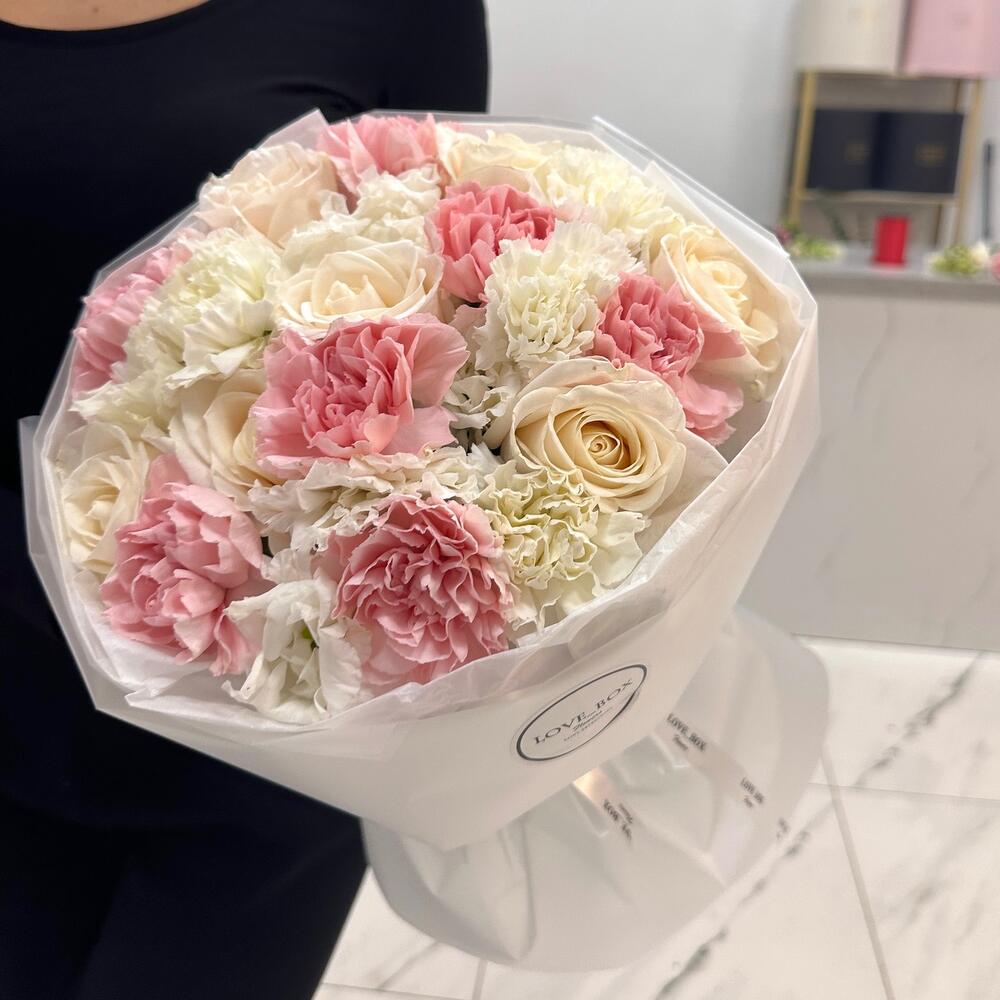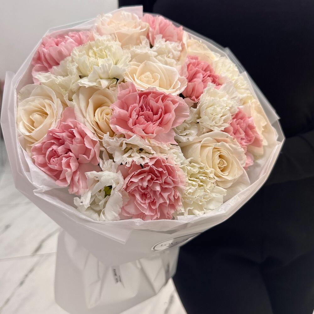 Роза Эквадор – 7 шт.Диантус – 11 шт.Лизиантус – 3 шт.Авторская упаковка – 4 шт.