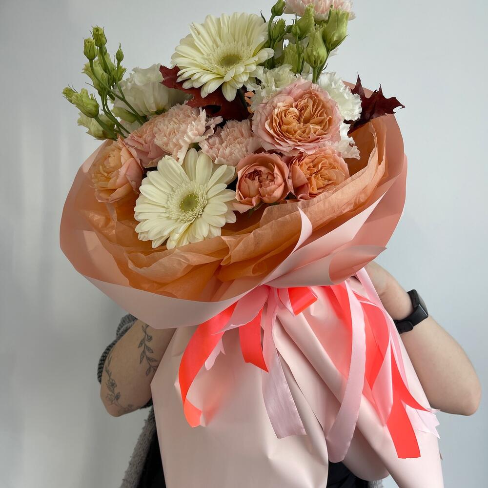 Салал – 2 шт.Эустома – 2 шт.Лента атласная – 2 шт.Гербера – 2 шт.Диантус – 3 шт.Упаковка дизайнерская – 2 шт.Листья Дуба – 1 шт.джульетта кустовая роза пионовидная – 2 шт.