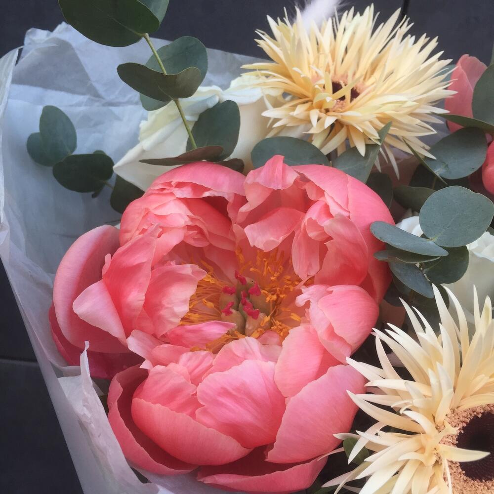 Пион – 2 шт.Эвкалипт – 1 шт.Роза – 3 шт.Гербера – 2 шт.