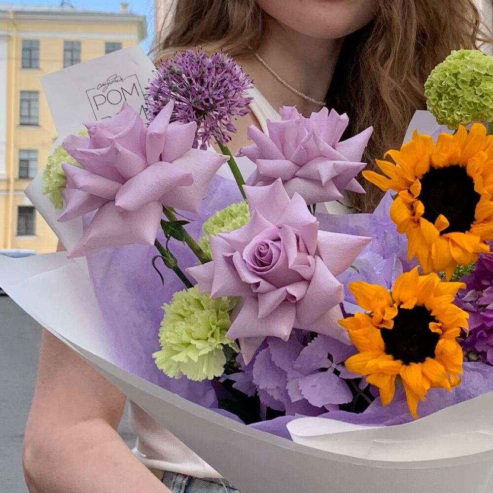 Роза – 3 шт.Гортензия – 1 шт.Подсолнух – 2 шт.Вибурнум – 1 шт.Гвоздика – 3 шт.Аллиум – 1 шт.Маттиола – 2 шт.Лагурус – 1 шт.Упаковка дизайнерская – 1 шт.