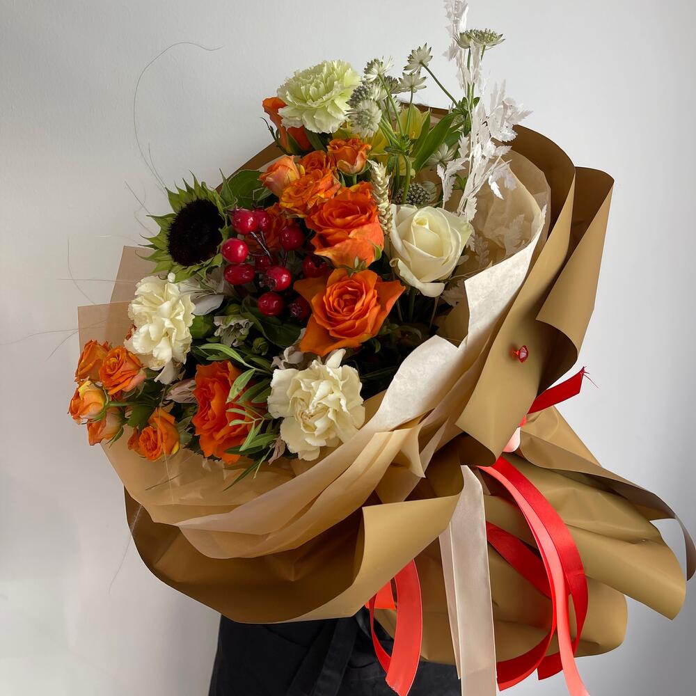 Подсолнух – 1 шт.Диантус – 3 шт.Альстромерия – 2 шт.Кустовая роза – 2 шт.Роза Россия – 5 шт.Астранция – 1 шт.Ягоды декоративные – 1 шт.Папоротник – 1 шт.Фисташка пучок – 1 шт.Пленка матовая – 6 шт.Лента атласная – 2 шт.