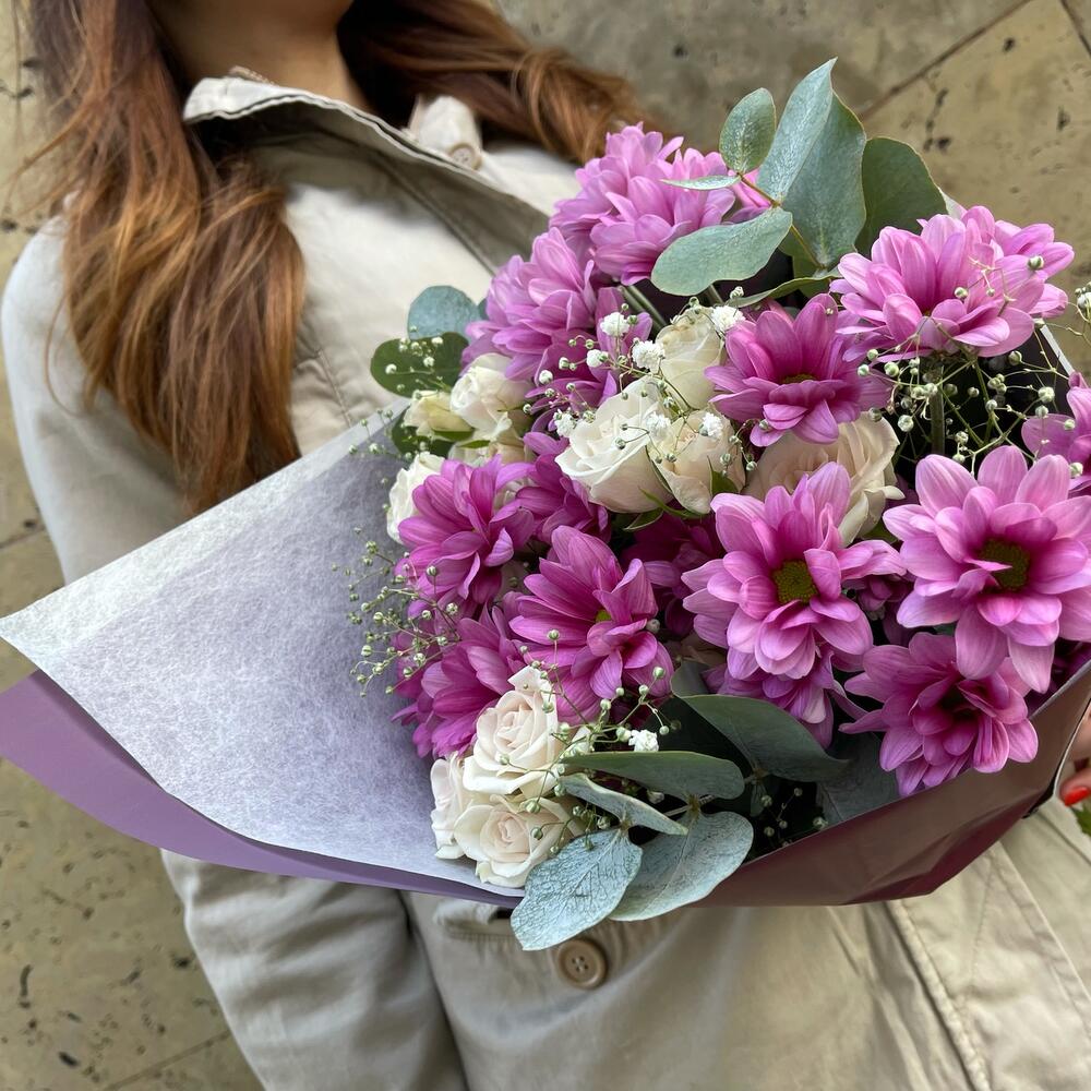 Хризантема кустовая – 4 шт.Роза кустовая – 3 шт.Гипсофила – 1 шт.Эвкалипт – 3 шт.Тишью белое – 1 шт.Бумага – 1 шт.Лента – 1 шт.