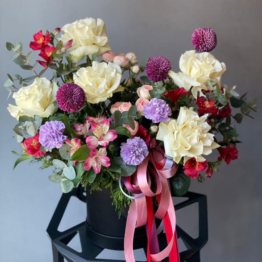 Коробка шляпная – 1 шт.Губка оазис – 3 шт.Хризантема – 3 шт.Альстромерия – 3 шт.Роза – 5 шт.Роза кустовая – 3 шт.Эвкалипт – 5 шт.Гвоздика – 3 шт.Лента атласная – 4 шт.