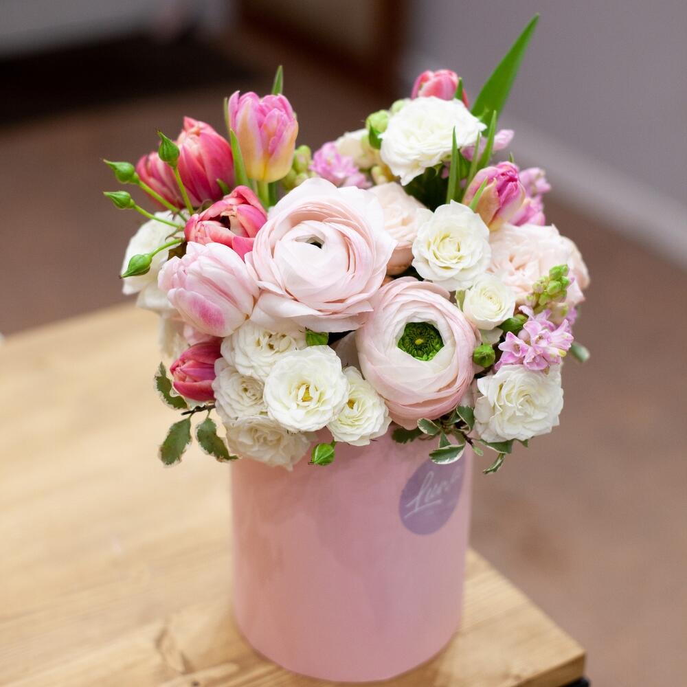 Нежная композиция с розовыми лютиками в шляпной коробке ❤️