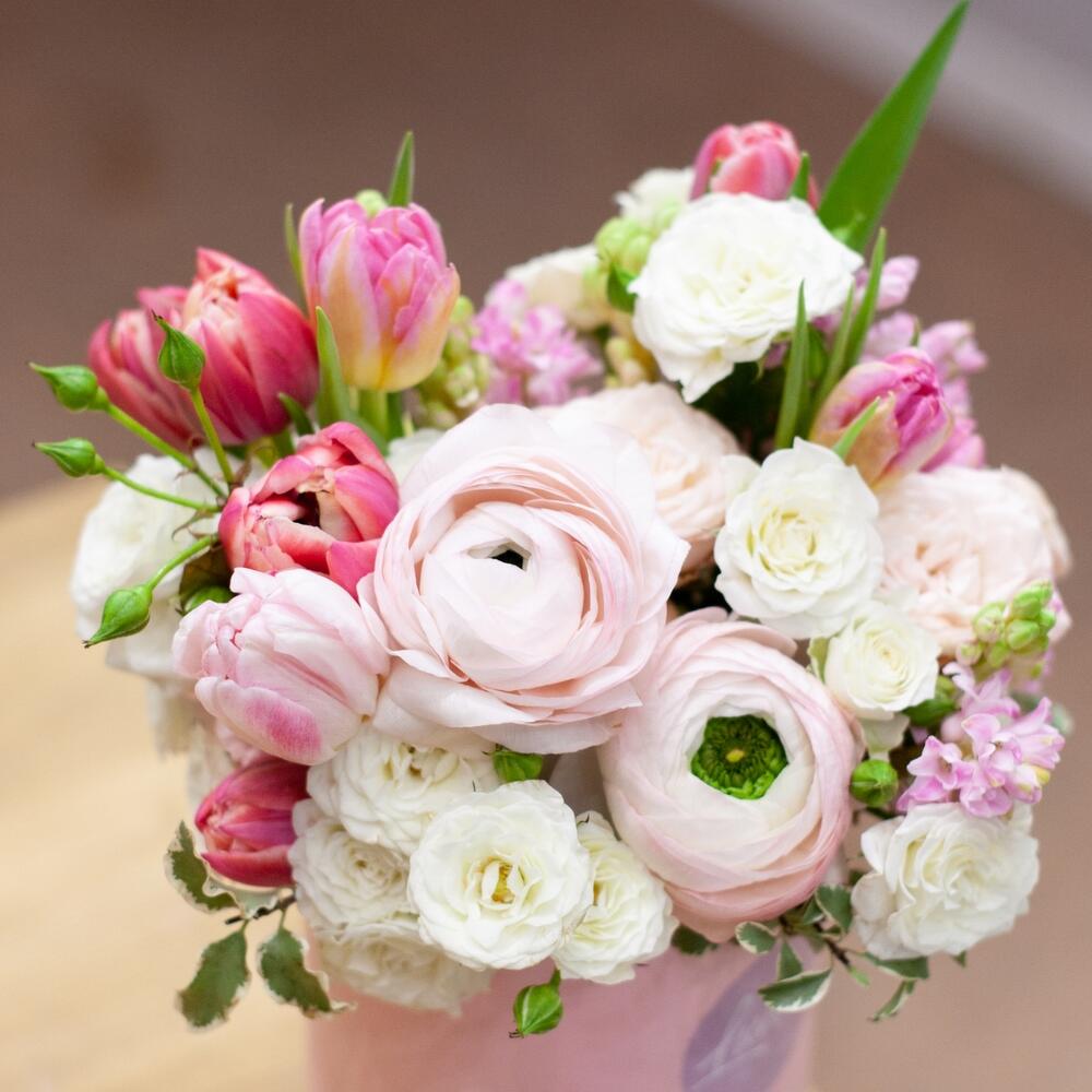 Кустовая роза – 4 шт.Тюльпан пионовидный – 8 шт.Диантус – 2 шт.Ранункулюс – 2 шт.
