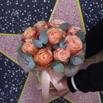 Роза пионовидная кахала – 9 шт.Эвкалипт – 3 шт.Оазис флористический – 1 шт.Пленка дизайнерская – 2 шт.Шляпная коробка – 1 шт.