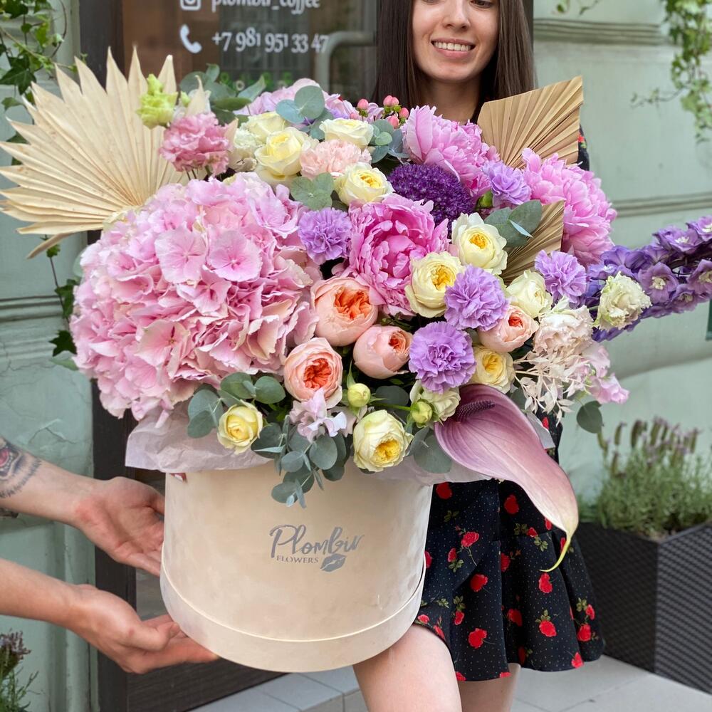 Гортензия – 1 шт.Коробка шляпная – 1 шт.Оазис флористический – 2 шт.Пион – 3 шт.Роза – 5 шт.Роза кустовая – 5 шт.Эустома – 5 шт.Зелень – 5 шт.Сухоцветы – 5 шт.