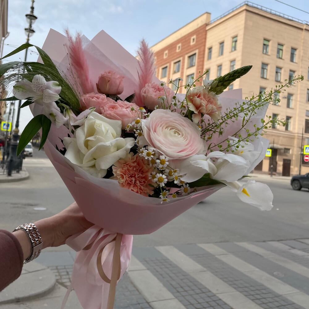 Ранункулюс – 1 шт.Роза кустовая пионовидная – 1 шт.Роза белая – 1 шт.Танацетум – 1 шт.Паникум – 1 шт.Тласпи – 1 шт.Орнитогалум – 1 шт.Гвоздика – 2 шт.Упаковка дизайнерская – 1 шт.