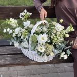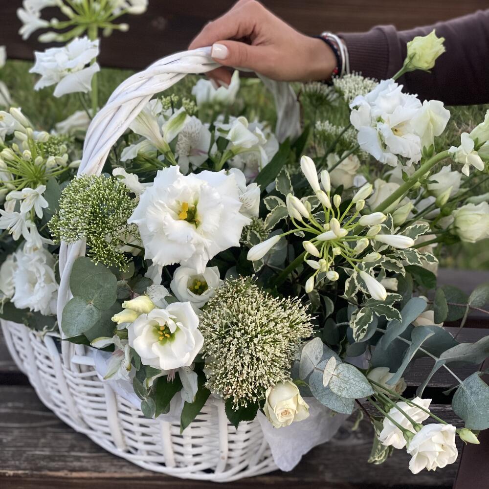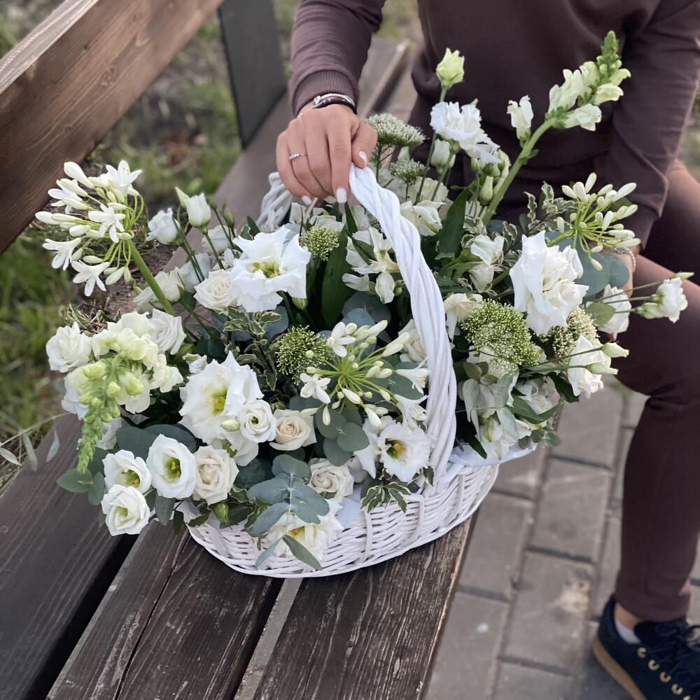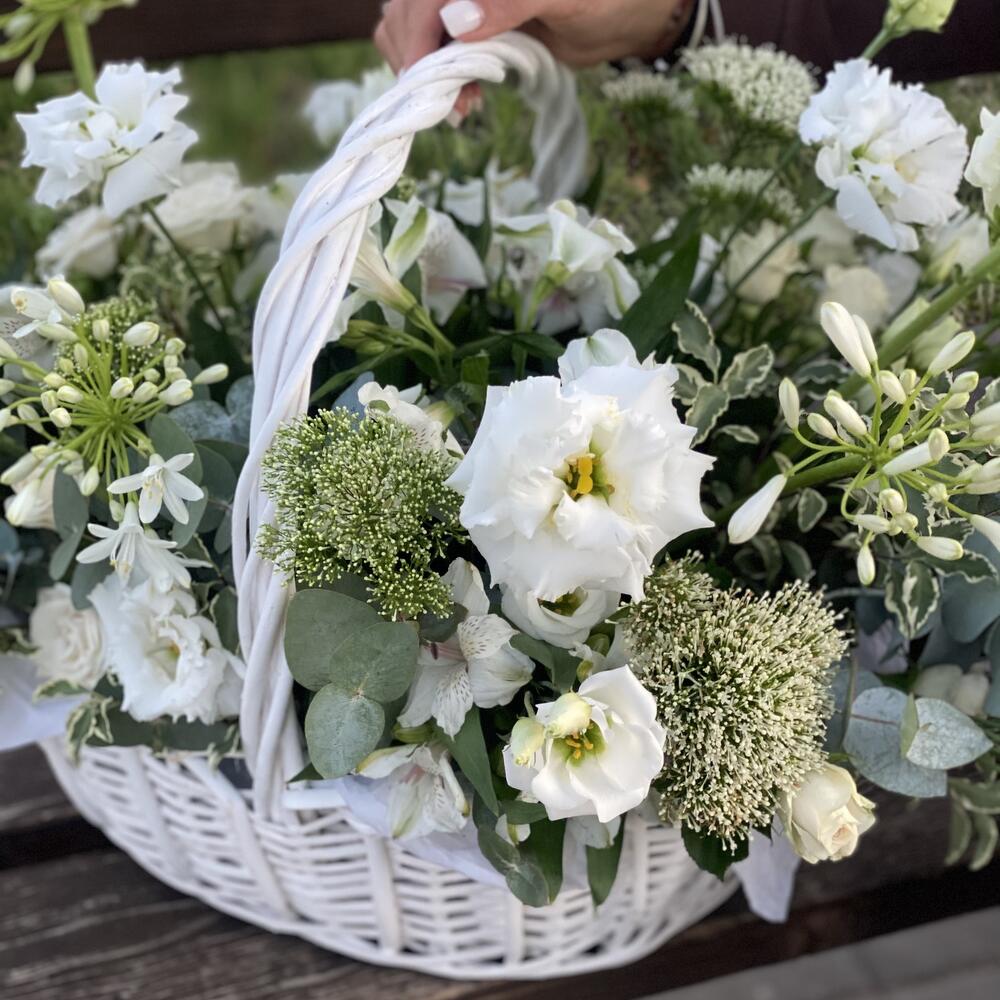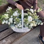 Корзина – 1 шт. Оазис – 3 шт. Кустовая роза – 3 шт. Альстромерия – 5 шт. Эвкалипт – 3 шт. Трахелиум – 3 шт. Агапантус – 3 шт. Антуриум – 2 шт. Эустома – 6 шт. Питтоспорум – 1 шт. Оформление – 1 шт.