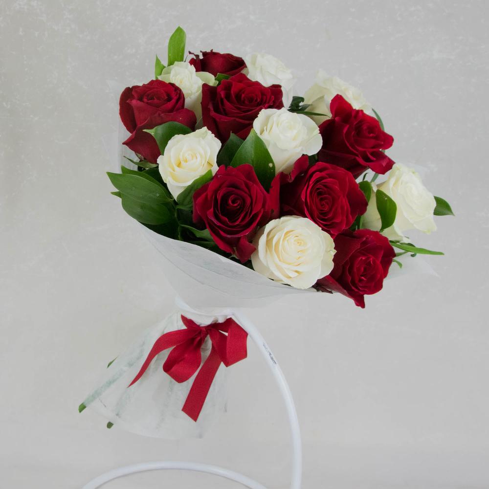Букет из красных и белых роз с упаковкой. Приблизительный размер 35×65 Букет для тех, кто любит все естественное. Букет обернут натуральным крафтом в таких же тонах. Все символизирует вместо близости к природе. К подарку обычно прикладывается наша карточка с красиво напечатанным текстом вашего послания. К букетам обычно прилагается рекомендация по уходу и объяснением причин. При доставке температура в машине курьера контролируется нами в зависимости от сезона.