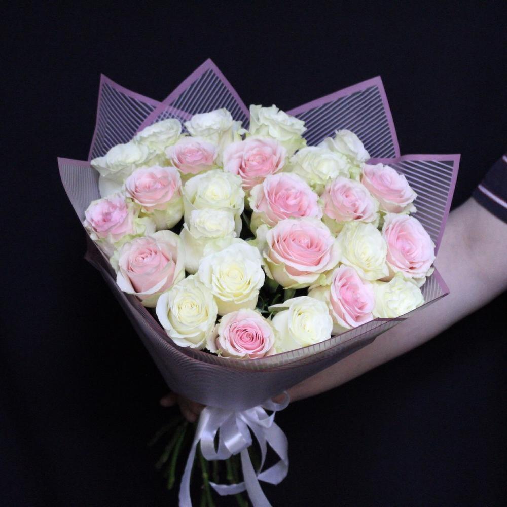 Роза Мондиаль – 13 шт.роза фруттето – 12 шт.Пленка дизайнерская – 2 шт.Лента атласная – 1 шт.