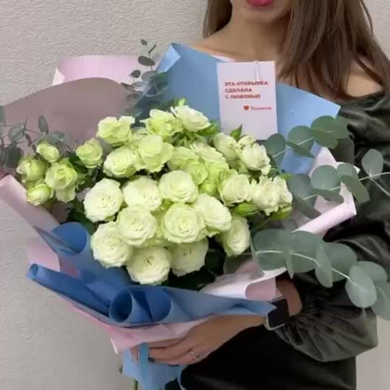 Роза кустовая – 7 шт.Эвкалипт – 1 шт.Упаковка дизайнерская – 2 шт.Лента атласная – 1 шт.