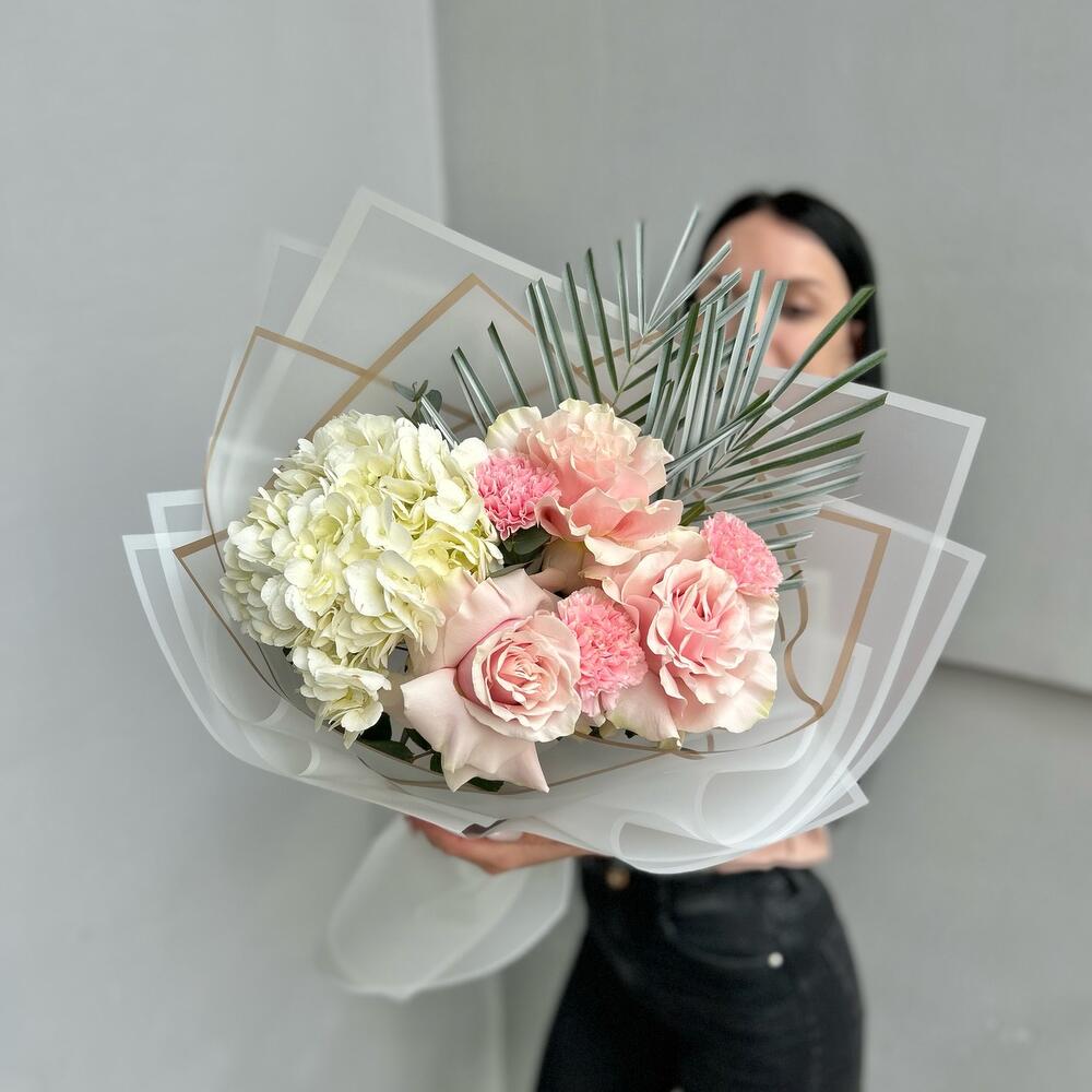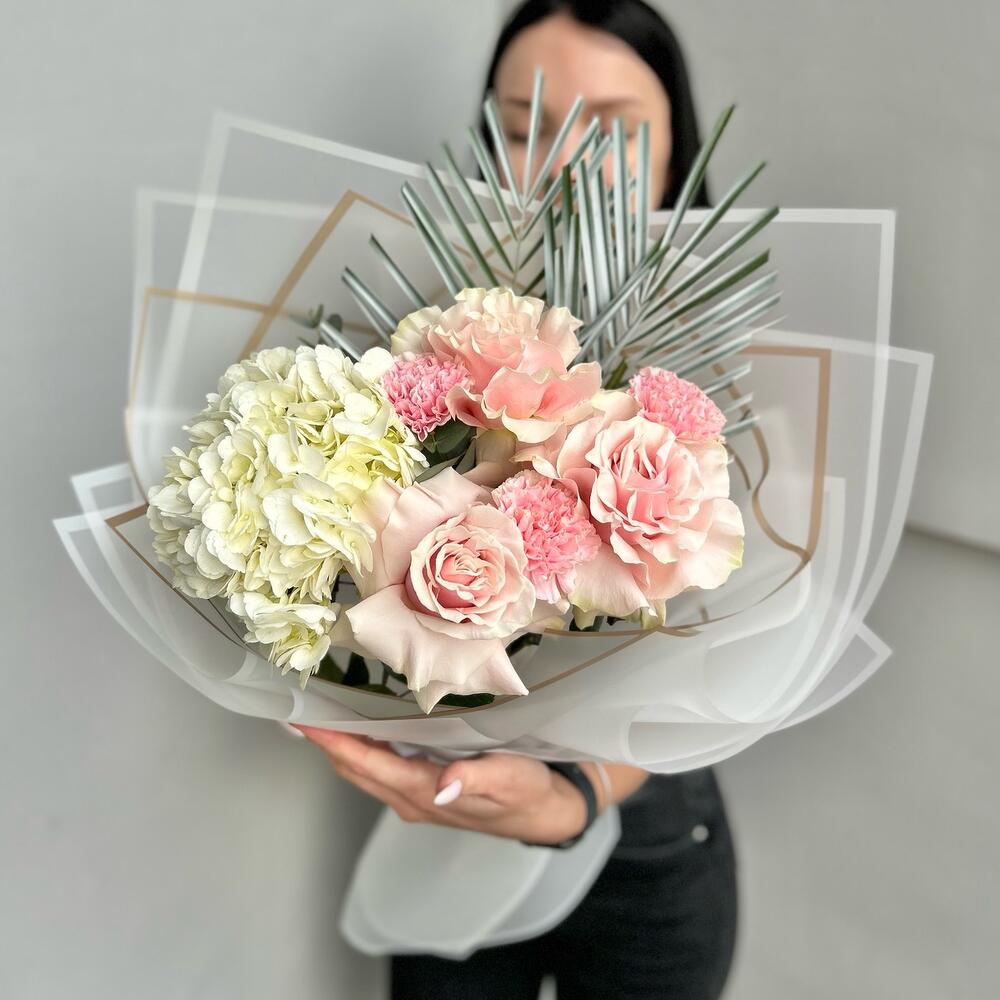 Гортензия – 1 шт.Роза Эквадор – 3 шт.Лента атласная – 2 шт.Диантус – 4 шт.Пальма – 2 шт.Упаковка дизайнерская – 5 шт.