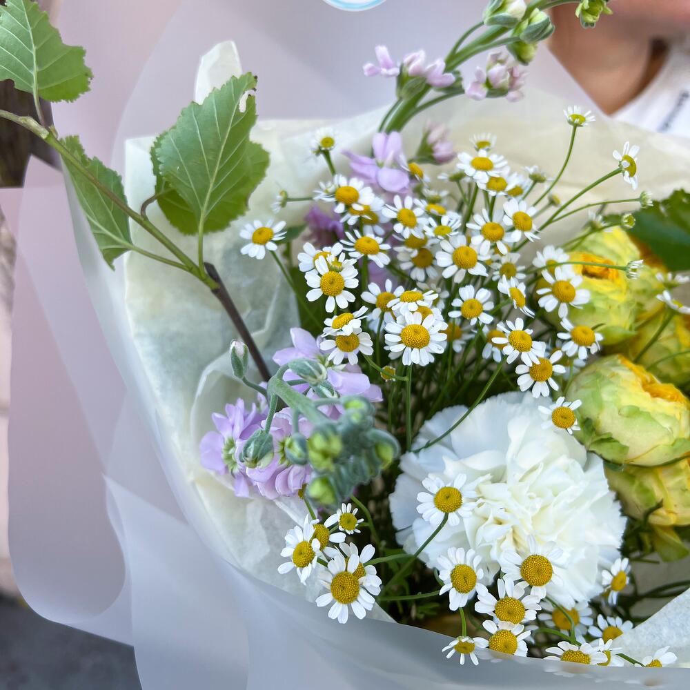 Нежный и легкий букет с садовой кустовой розой, маттиолой, ромашкой, гвоздиками и ветками березы