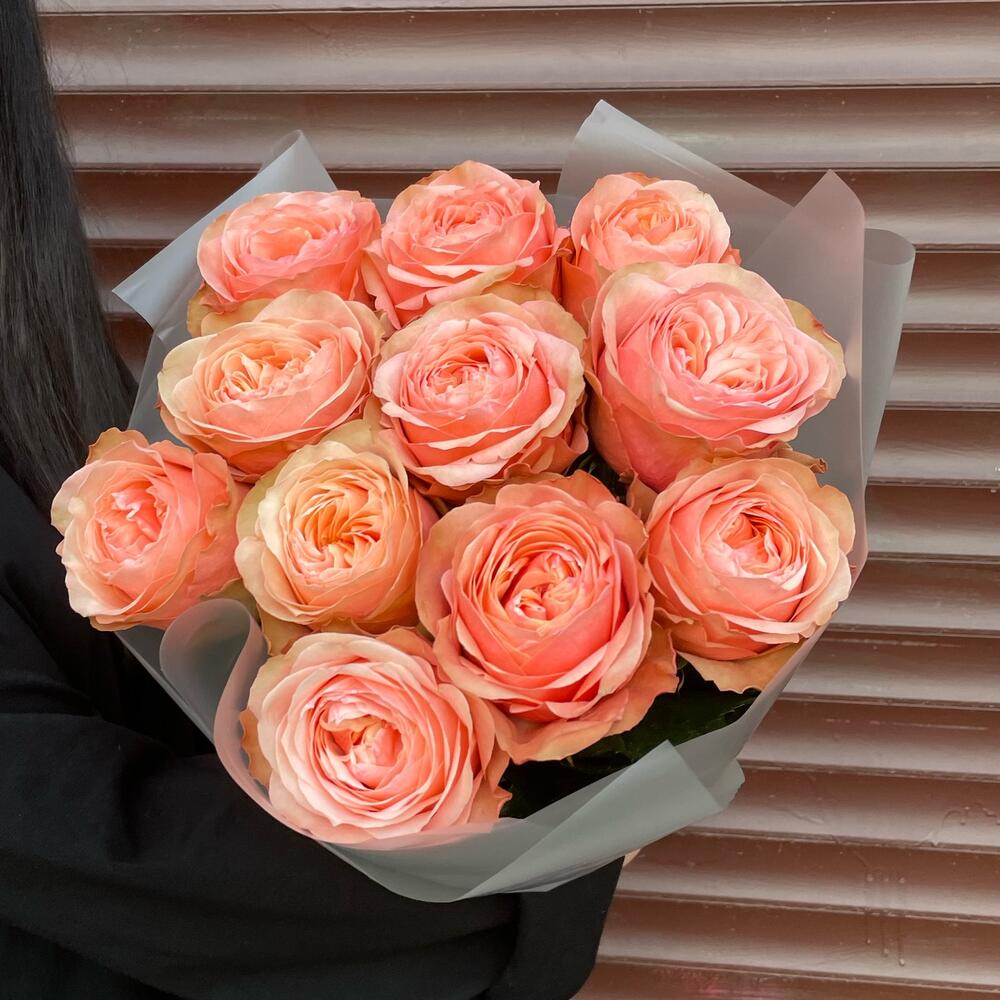 Шикарный букет из 11 крупных пионовидных роз «Кахала».Персиковые крупные бутоны с нежно-розовыми лепестками. Эффектный подарок на любой праздник. Очень долго стоят.